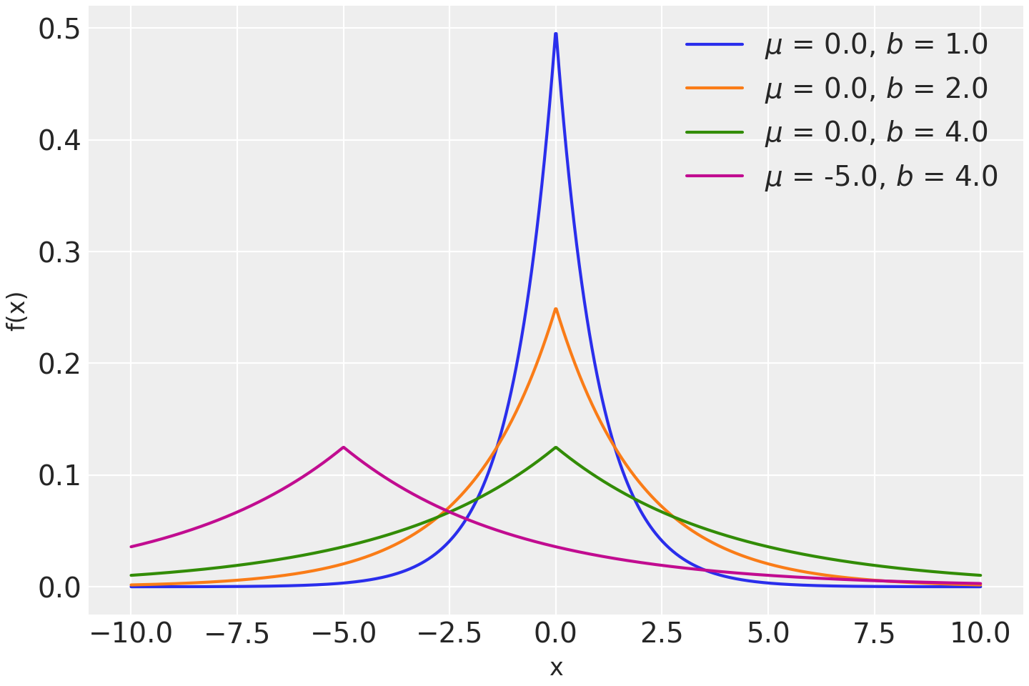 \[f(x \mid \mu, b) = \frac{1}{2b} \exp \left\{ - \frac{|x - \mu|}{b} \right\}\]